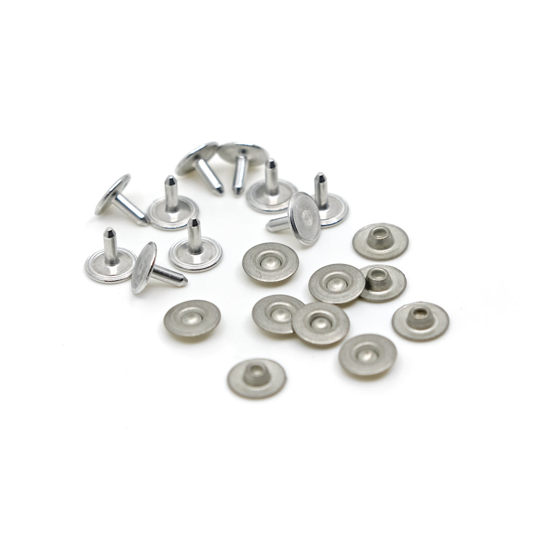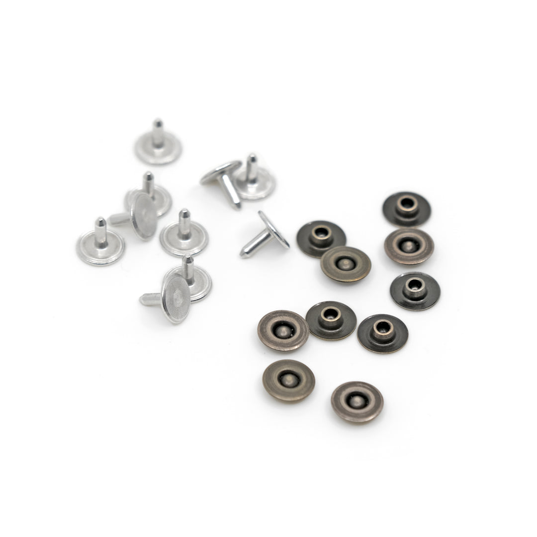 Set of 10 jeans rivets (10mm wide). These rivets can be installed at home without any fancy tools - just a hammer, wire cutter, and a solid metal or cast iron surface.