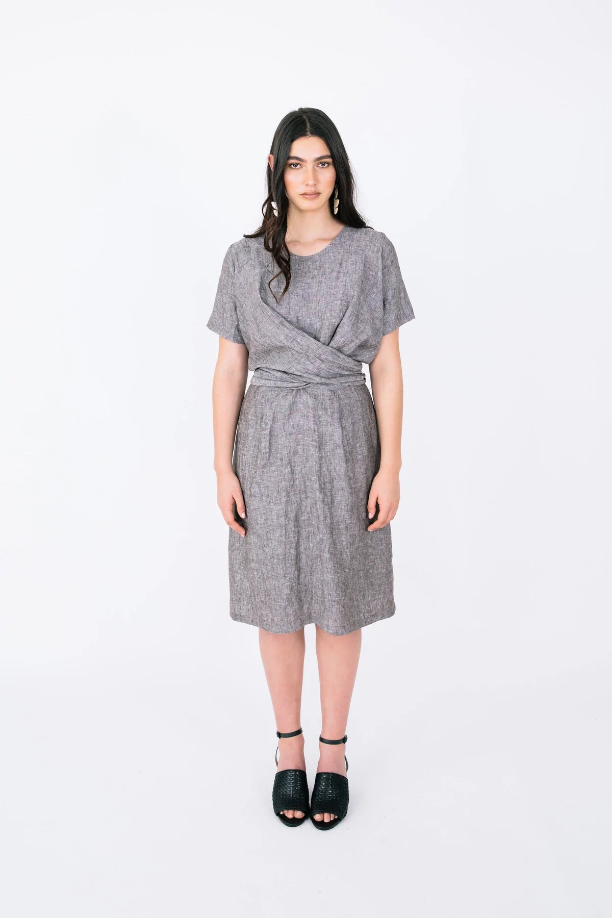 An elegant trans-seasonal dress for any occasion. Featuring front wrap around ties, a button and loop closure with an invisible zipper fastening at the back, front and back neck facings, front and back pleats on skirt. Make it in a long or short sleeve option, as well as the choice between two skirt length options.